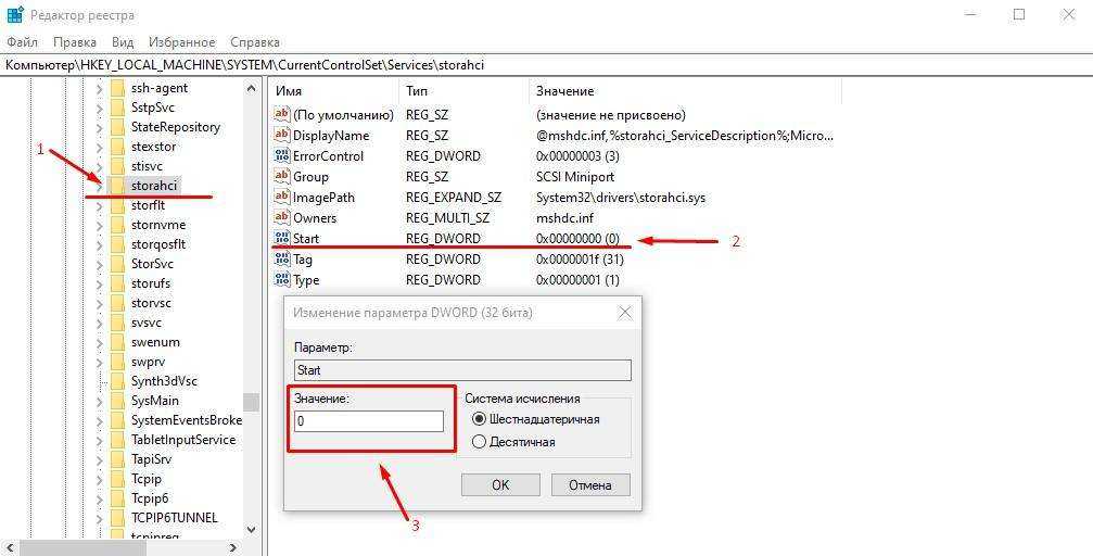 Теперь листаем вниз, ищем раздел «storahci». Нажимаем на него, и выбираем параметр «Start». В строке «Значение» также ставим ноль.
