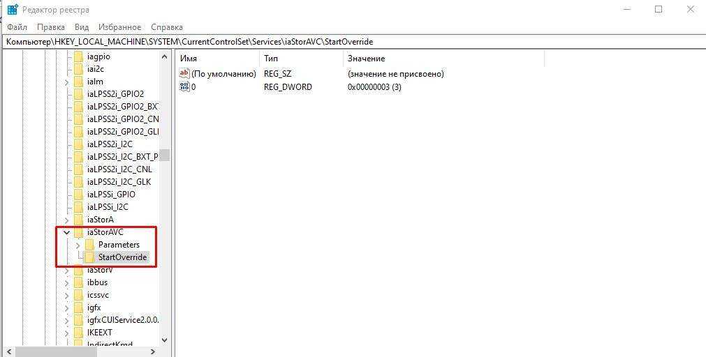 Чуть выше будет раздел «iaStorAV» или «iaStorAVС» (как в моём случае). Открываем его, затем открываем «StartOverride».