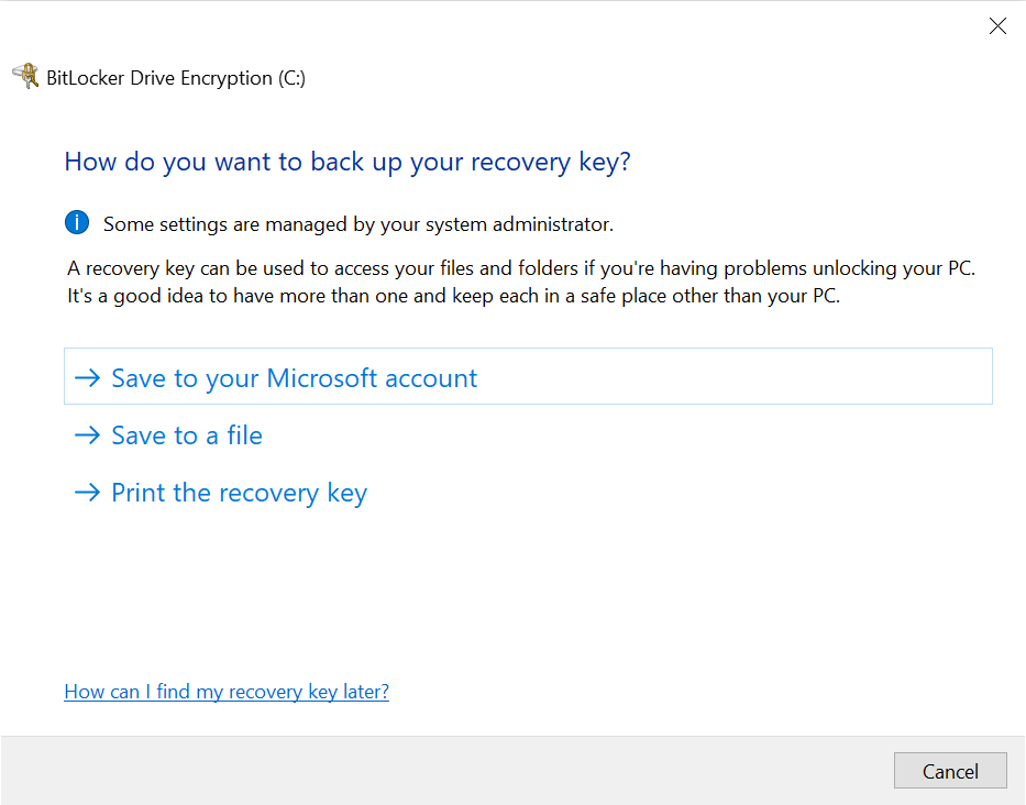 Вы можете выбрать любой из четырех или нескольких вариантов. Тем не менее, мы рекомендуем сохранить ключ восстановления на USB-накопителе в шкафчике или сейфе без риска потерять или раскрыть его.
