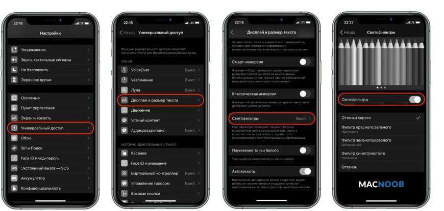 Гаджеты на iOS также могут быть адаптированы таким образом, чтобы монохромность оставалась быстро доступной. Для этого перейдите в одноименный раздел и выберите опцию «Световые фильтры».