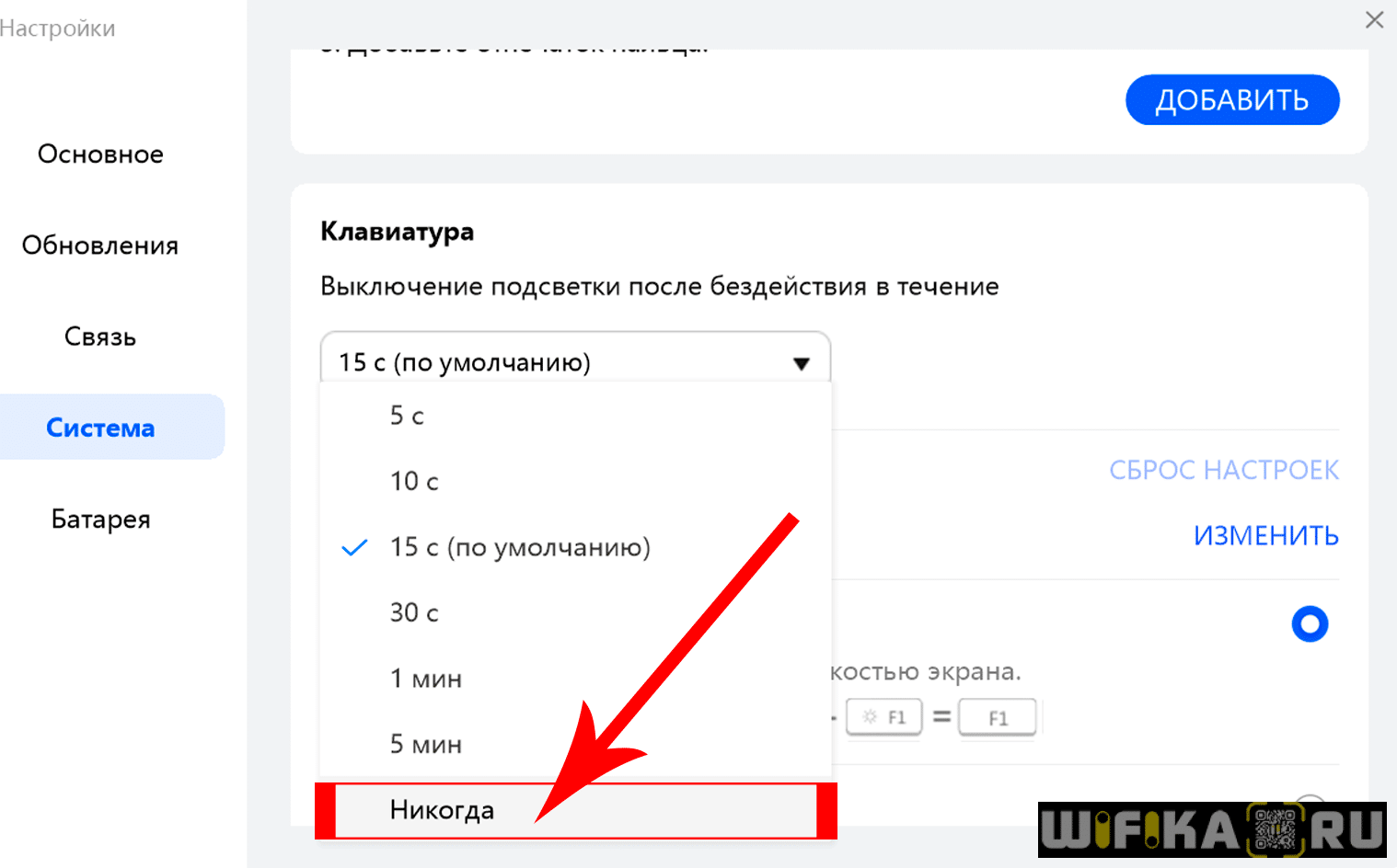 Переходим в меню «Система» и находим блок «Клавиатура». Как видим, для подсветки установлено значение «15 сек.»