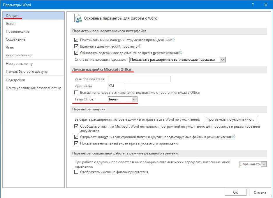 Что касается непосредственно самого меню Word — то для этого нажмите по меню «Файл / параметры» и во вкладке «Общие» укажите «Тему Office» . На выбор есть несколько штук: