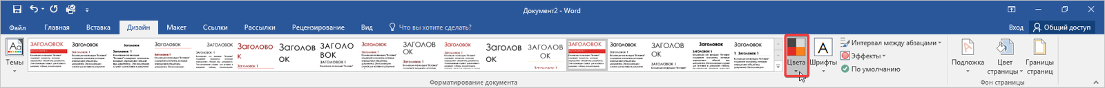 Конструктор — Цвет страницы (или цвета) — Word 2019