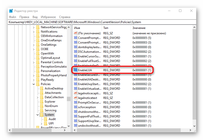 В Windows 10 необходимый нам параметр, который отвечает за отключение системы контроля учетных записей, находится в одном из ключей реестра.