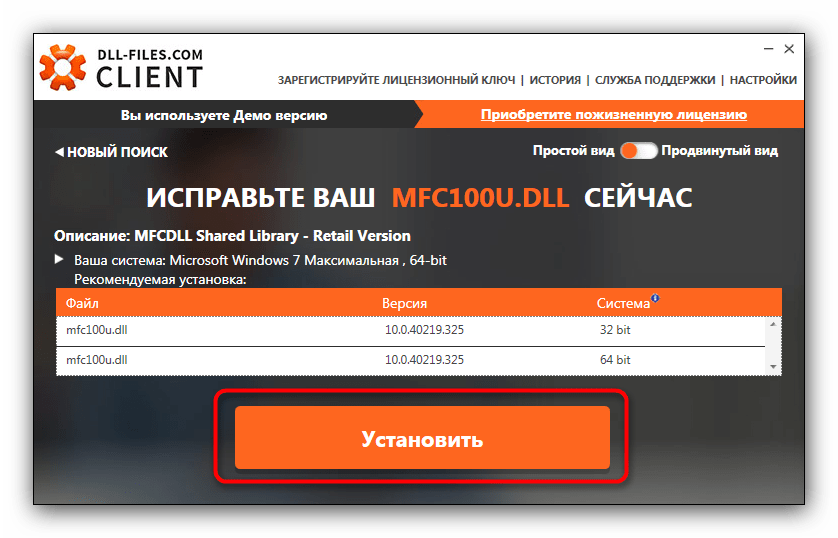 Давайте с помощью DLL-Files.com Client попробуем установить библиотеку Mfc140u.dll: