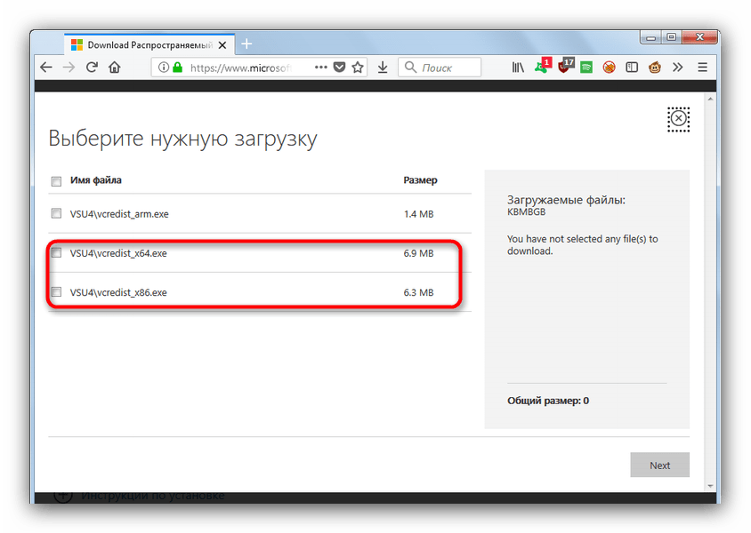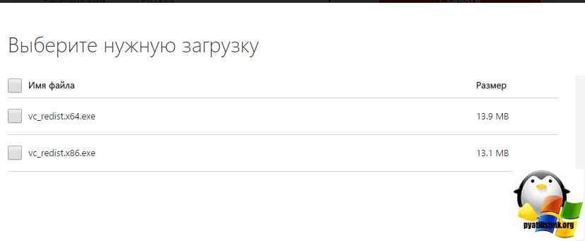 Шаг 2: Если имеем 64-битную Windows — отмечаем как x64, так и x86 (необходимо), если 32-разрядная, то одну x86. Загружаем на ПК;
