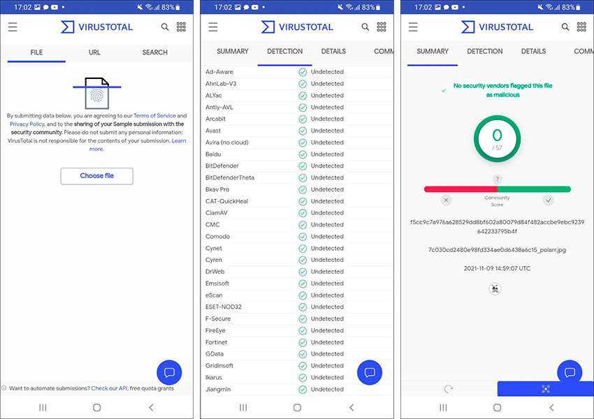 Загруженные файлы анализируются внутри AVC UnDroid, после чего пользователь получает детальный отчет о сканировании – файловые хэши, оценку безопасности и дополнительную информацию.