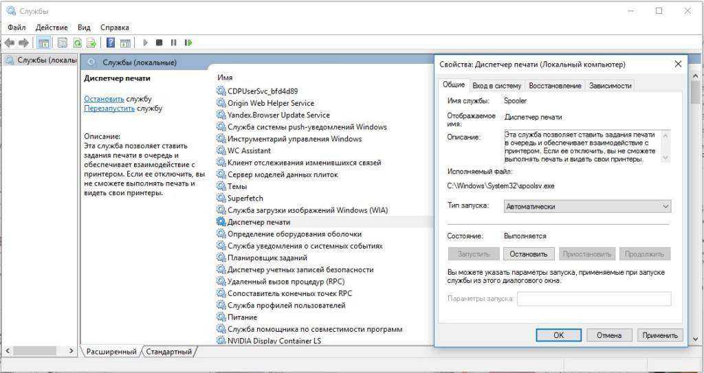 Теперь перезапускаем Диспетчер печати. Для этого нужно открыть «Службы», «Диспетчер печати». Остановить службу, а потом вновь её запустить. Или, еще лучше, просто Перезапустить.
