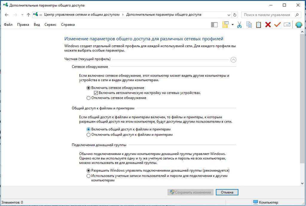 - Переходим в «Изменение дополнительные параметры общего доступа» и устанавливаем галочку возле «Включить общий доступ к файлам и принтерам».