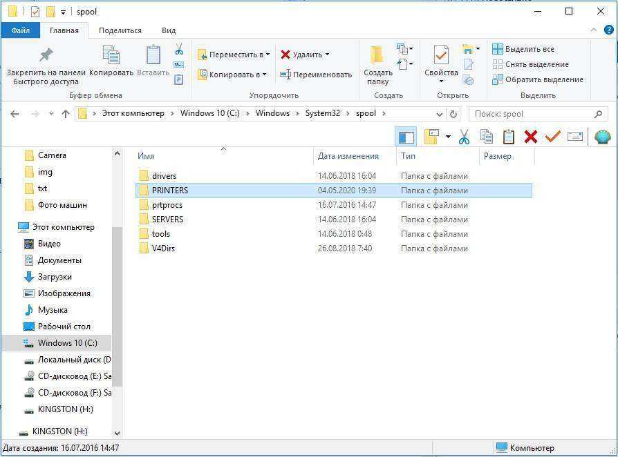 - Открываем папку по пути C:\Windows\System32\spool и выбираем каталог PRINTERS.