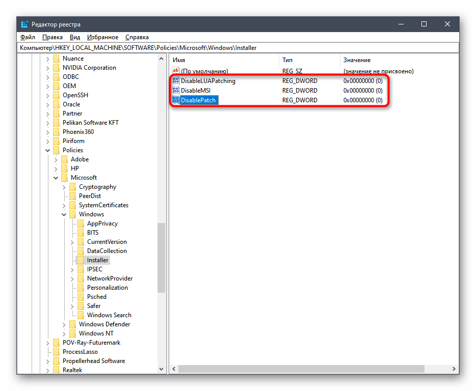 - Перейдите в раздел HKEY_LOCAL_MACHINE\SOFTWARE\Policies \Microsoft\Windows\Installer» найдите и удалите параметры DisableMSI и DisablePatch (при наличии, или измените на 0).