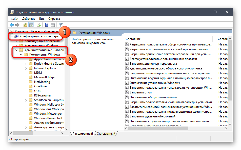 - В левой части экрана перейдите в раздел GPO «Конфигурация компьютера» — «Административные шаблоны» — «Компоненты Windows» — «Установщик Windows» (Computer Configuration -> Administrative Templates -> Windows Components -> Windows Installer).