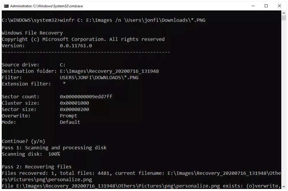 Чтобы восстановить файлы таким способом, скачайте и установите Windows File Recover. Затем найдите ее в меню Пуск и запустите. Когда вы окажетесь на экране, как показано выше, вы можете ввести такую команду, чтобы восстановить все изображения с расширением PNG из папки Downloads диска C и скопировать их в папку Images на диске E:
