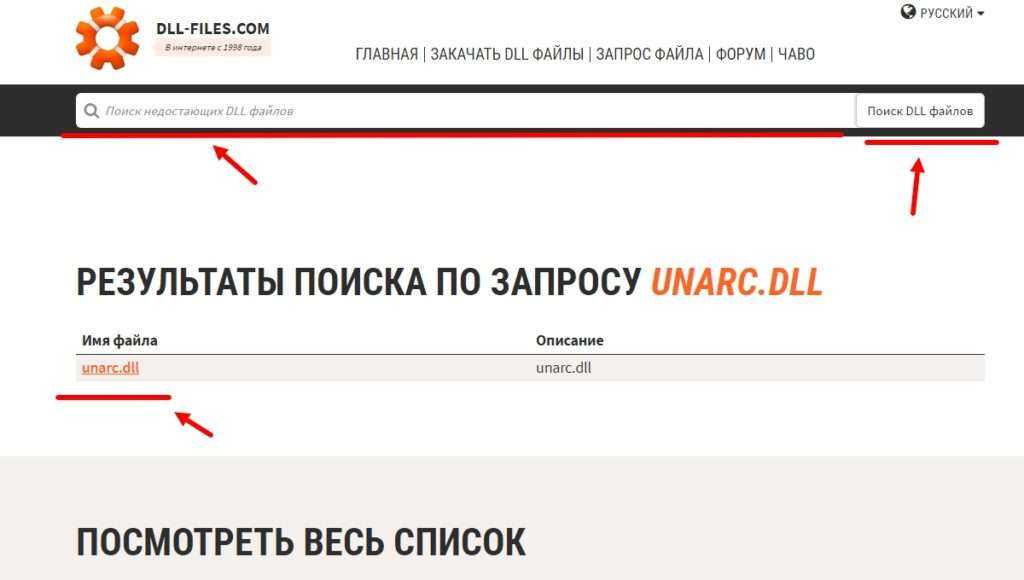 В поле «Поиск недостающих Dll файлов» введите имя, которое подсказала вам система например: unarc.dll и нажмите «Поиск DLL файлов».